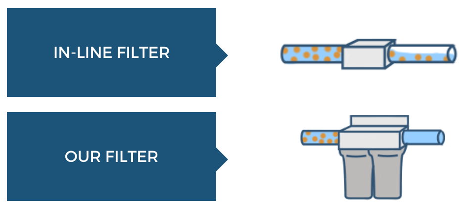 Cheap In-line filters are commonly rated at 100 microns - or not at all. Our Essential Series goes down to 0.5 Microns. The Virus Hero(TM) filter elements have an “absolute” rating at 0.2 microns, removing or reducing contaminants, viruses, and pathogens other filters can't.